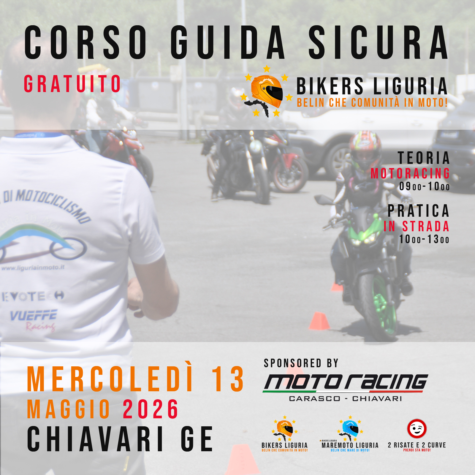 Corso di guida sicura gratuito per 5 membri della community, tenuto da LIGURIA IN MOTO e ospitato da MOTORACING. Teoria presso il concessionario e sessione di pratica nell'entroterra di CHIAVARI. Corso aperto a tutti i brand.