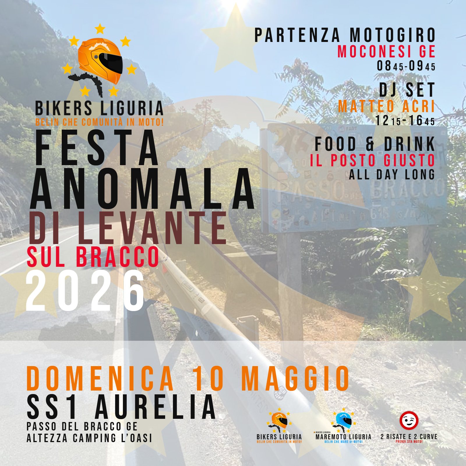 Un motogiro BIKERS LIGURIA ti porterà alla FESTA ANOMALA DI LEVANTE SUL BRACCO, dove festeggeremo l'arrivo del caldo! Dalle 12:15 alle 16:45 il DJ Set del nostro biker Matteo Acri ci farà ballare sul passo più famoso del Levante Ligure, e se ti viene fame puoi risparmiare con il Voucher Sconto BIKERS LIGURIA per IL POSTO GIUSTO!