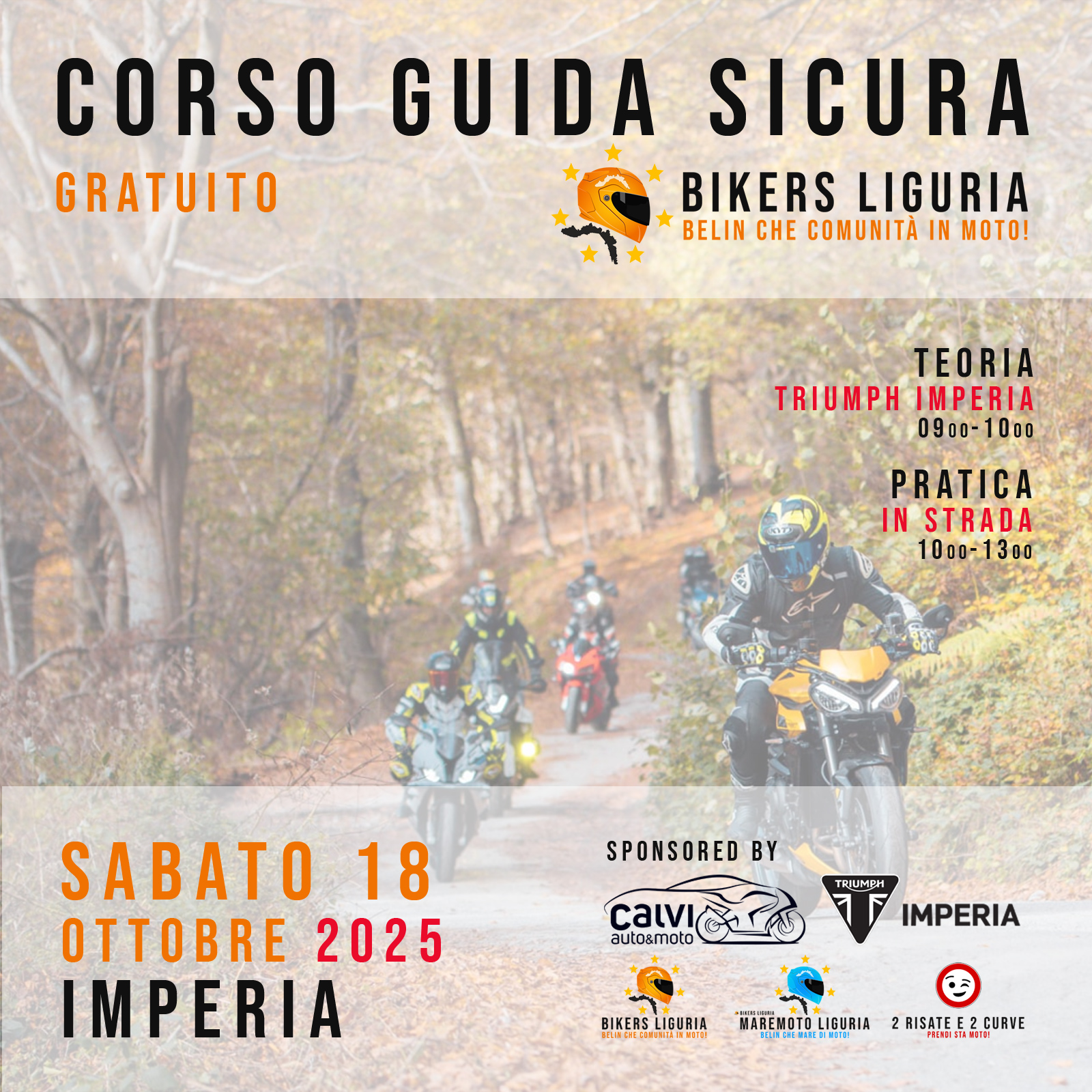 Corso di guida sicura gratuito per 5 membri della community, tenuto da istruttori certificati e sponsorizzato da CALVI - TRIUMPH IMPERIA. Teoria presso il concessionario e sessione di pratica nell'entroterra di IMPERIA. Corso aperto a tutti i brand.
